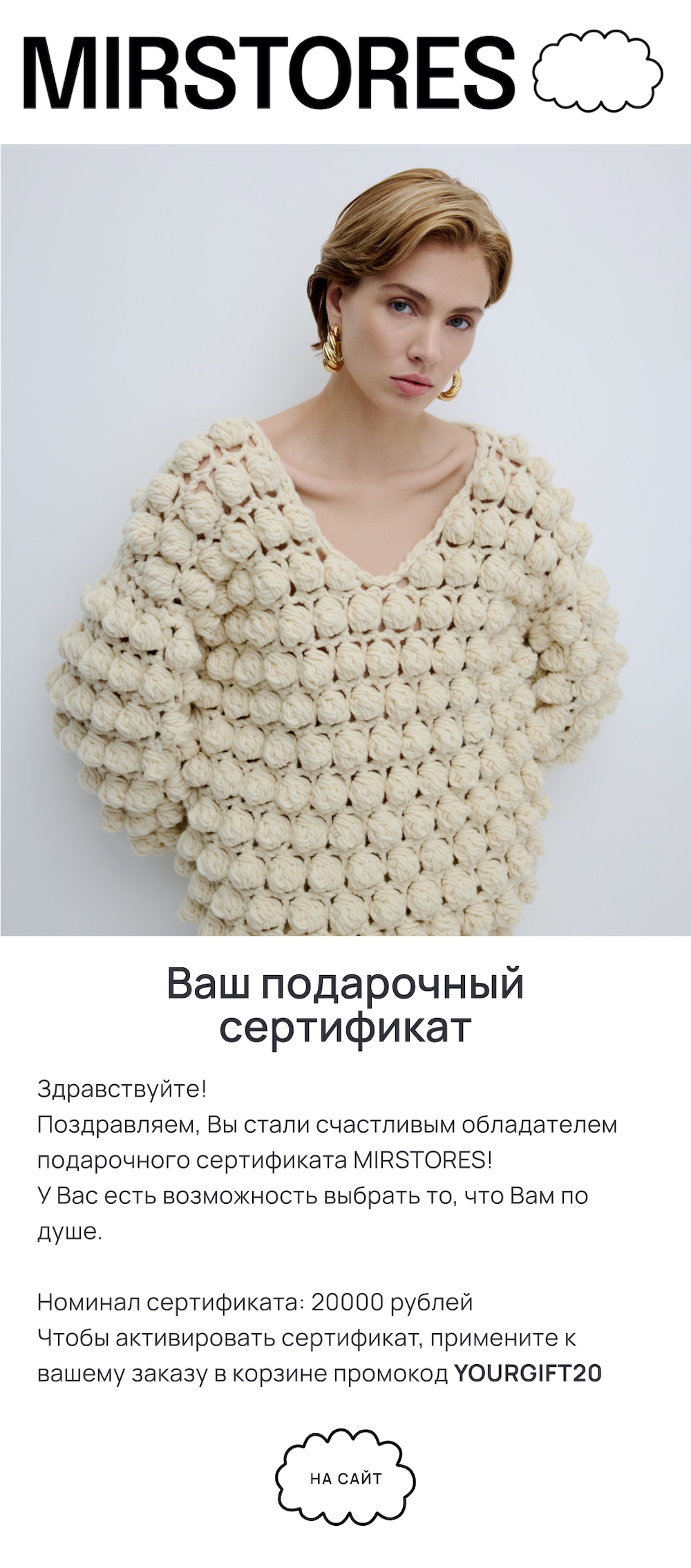 В этом году помимо кружки, которую Дед Мороз опрометчиво отправил UPS, а не доставил лично (на Медузе писали, что он просто не вывозит количество подарков, бедные олени!), я хотел бы подарить тебе тёплый свитер. Я побоялся промахнуться с размером (взял бы S - давай сравним), да и передать его тебе было бы непросто (из-за действующих ограничений на подарки), поэтому, как всегда в последнее время, отправляю тебе сертификат в магазин свитеров, который мне приглянулся. Это новогодний подарок, поэтому, выбери свитер, пожалуйста, и закажи его уже сейчас - на новогодних праздниках! И обязательно (обязательно!) пришли фото, когда он к тебе придёт и ты его на себя наденешь! А билеты в театр для твоей мамы. Поздравь её от меня тоже)